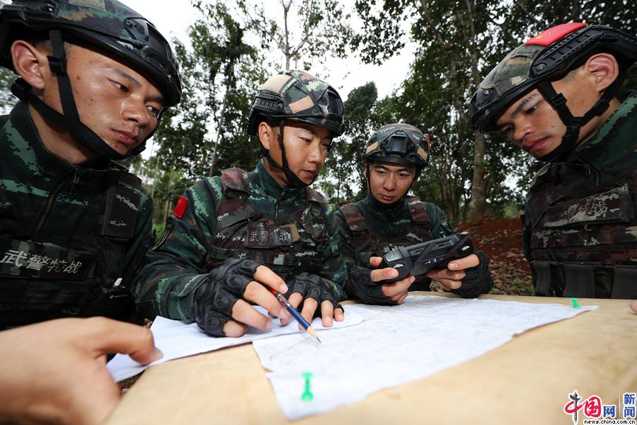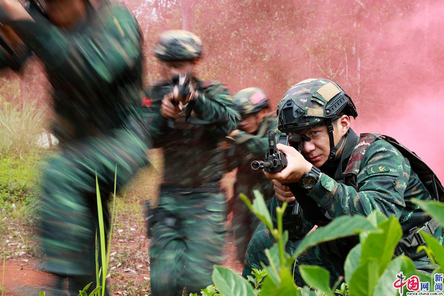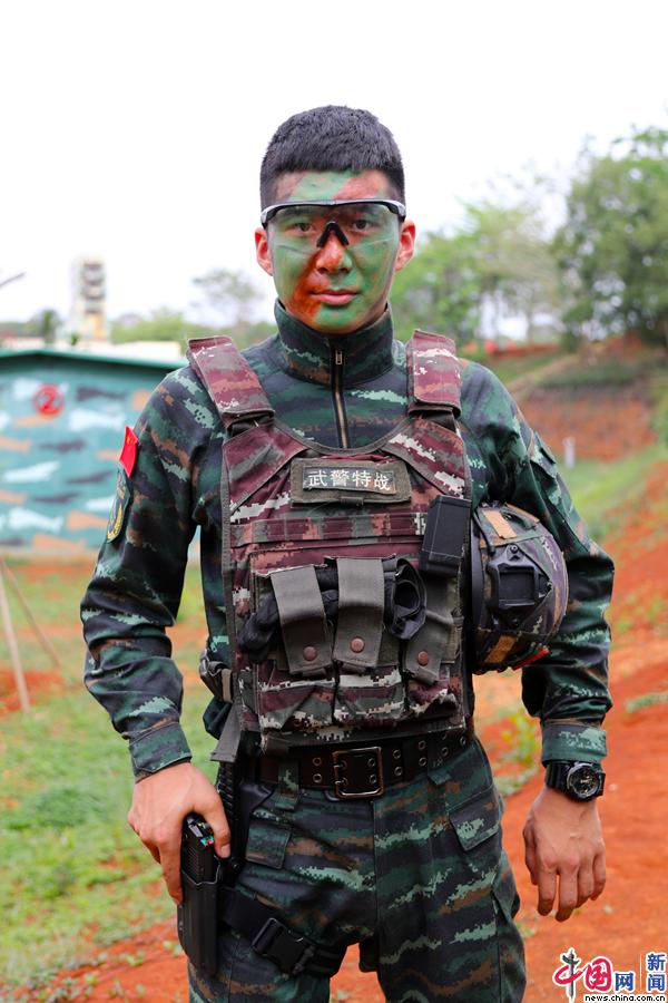 海南总队东山锻炼,一名全副武拆的特和队员持枪而立。哨声响起,他敏捷跨立沉肩,抬枪上膛,目光穿过准星紧紧钉正在30米外的靶心。